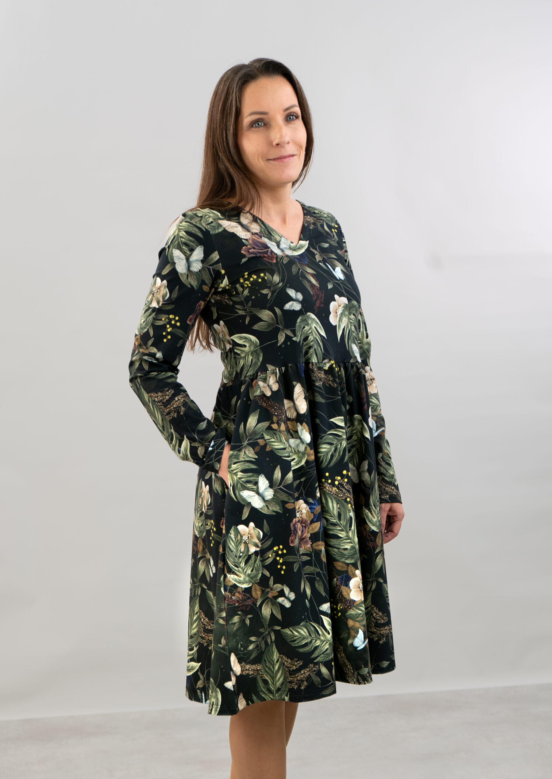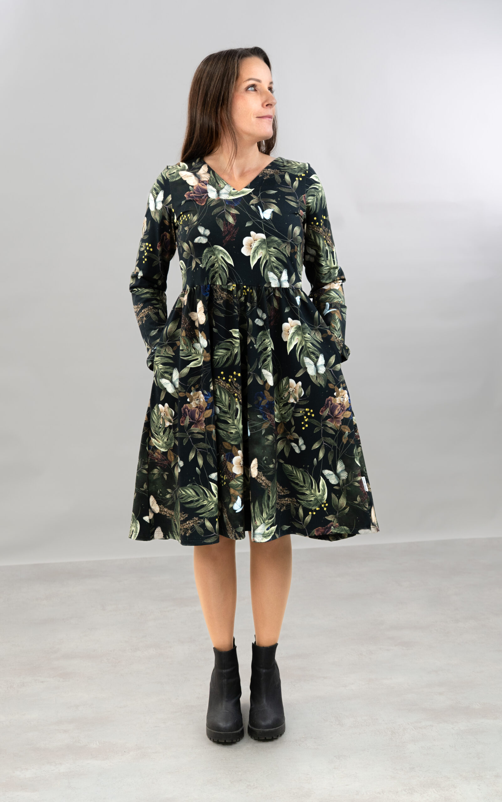 Velvet Wings -kuosissa tumma pohja ja vaaleammat luontoelementit luovat kauniin, elegantin kontrastin. Lehdet, kukat ja herkät perhoset tekevät kokonaisuudesta kevyen ja elävän, samalla kun syvä värimaailma tuo siihen rauhallista näyttävyyttä. Kuosi on yhtä aikaa herkkä, ajaton ja helposti puettava.