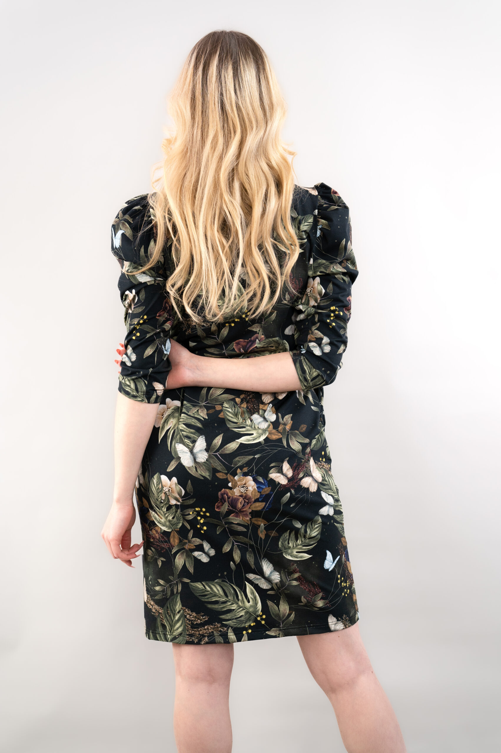 Velvet Wings -kuosissa tumma pohja ja vaaleammat luontoelementit luovat kauniin, elegantin kontrastin. Lehdet, kukat ja herkät perhoset tekevät kokonaisuudesta kevyen ja elävän, samalla kun syvä värimaailma tuo siihen rauhallista näyttävyyttä. Kuosi on yhtä aikaa herkkä, ajaton ja helposti puettava.