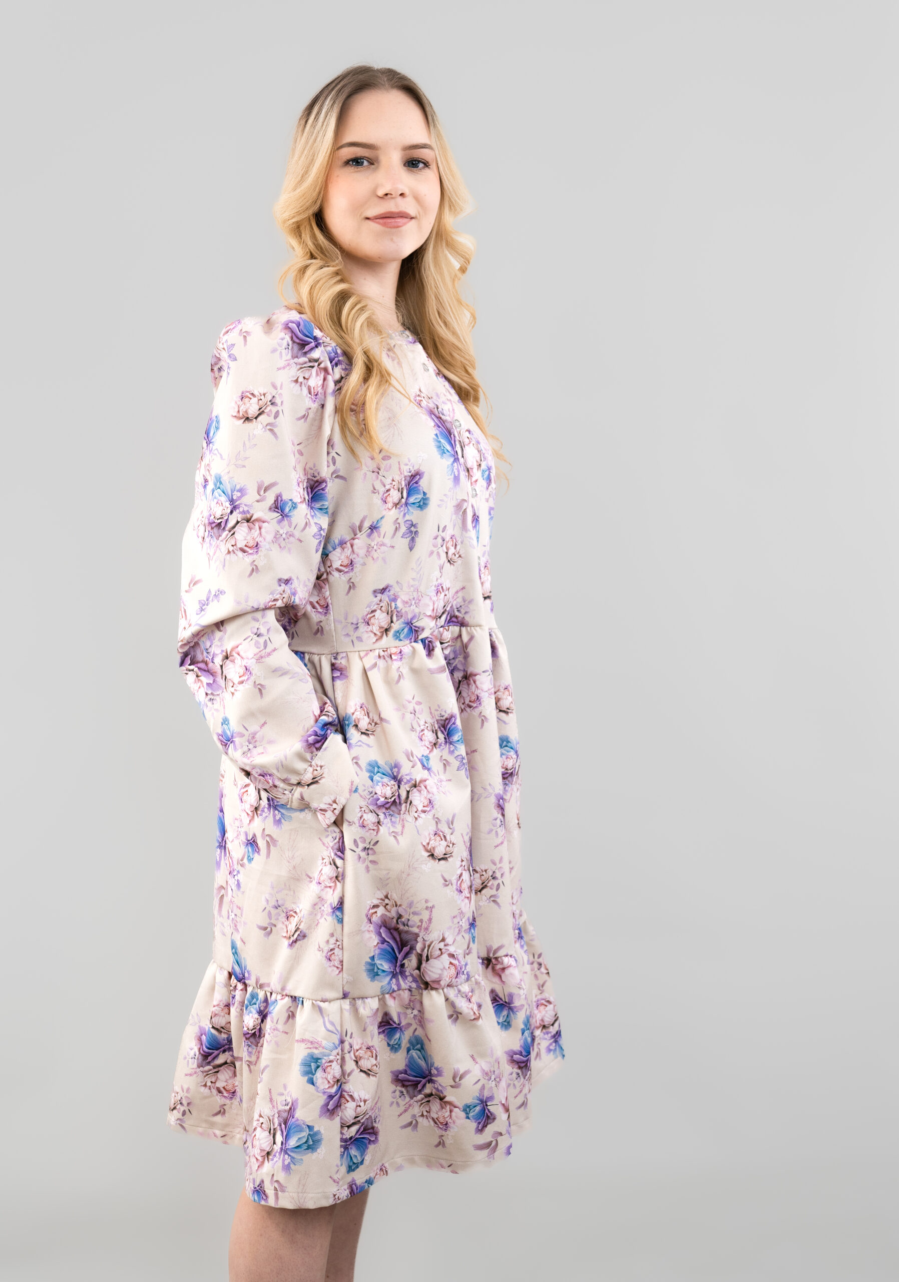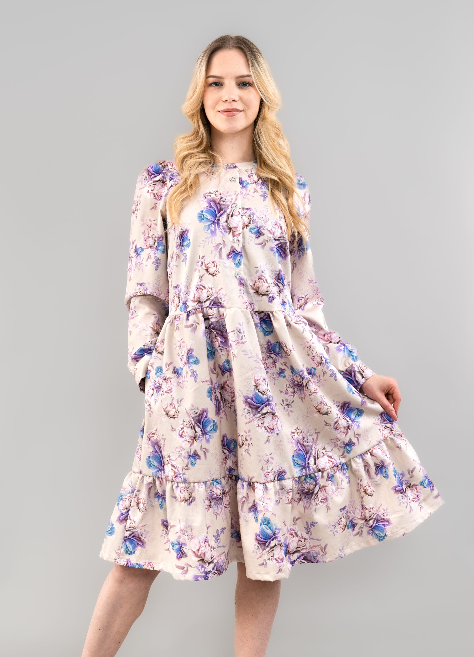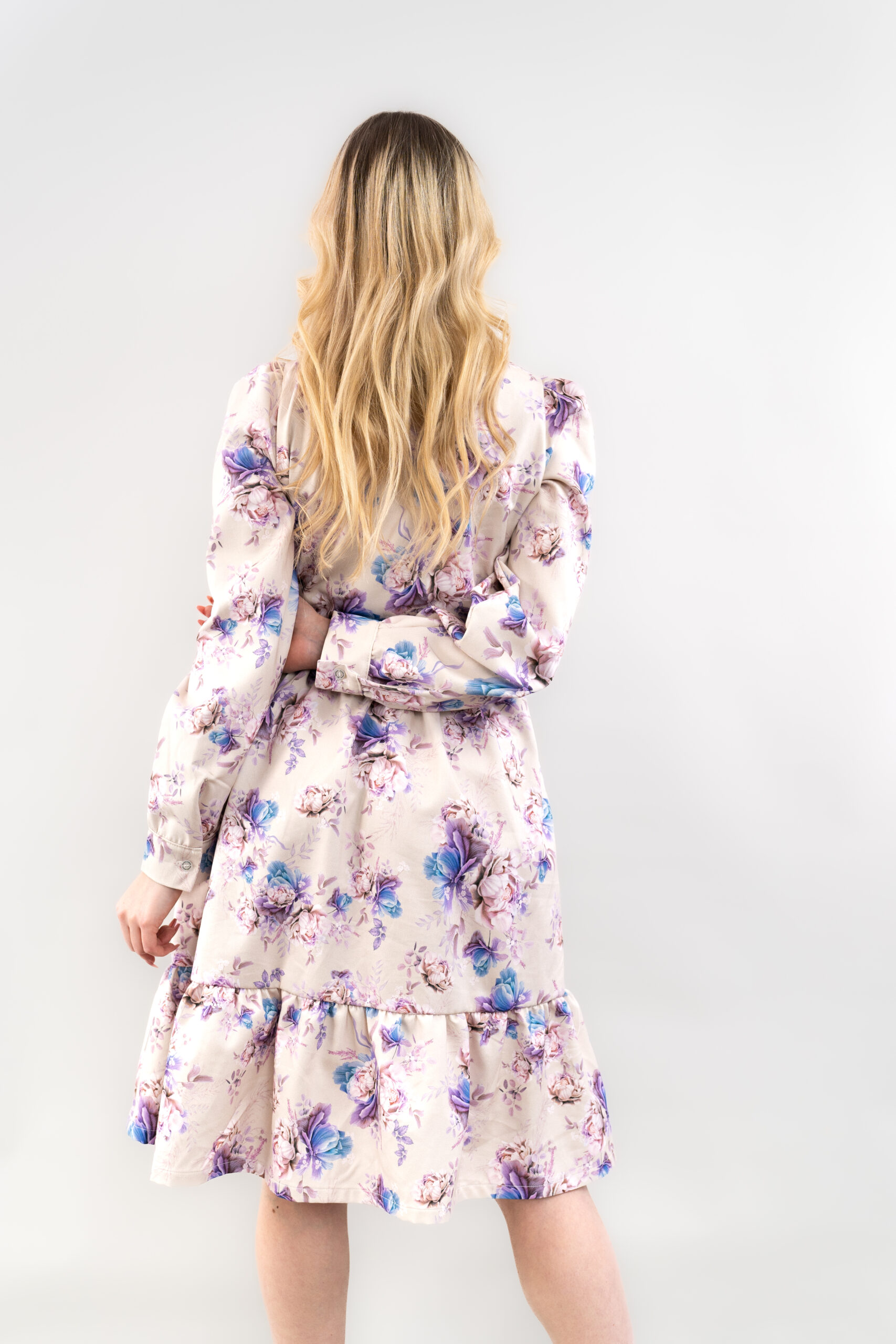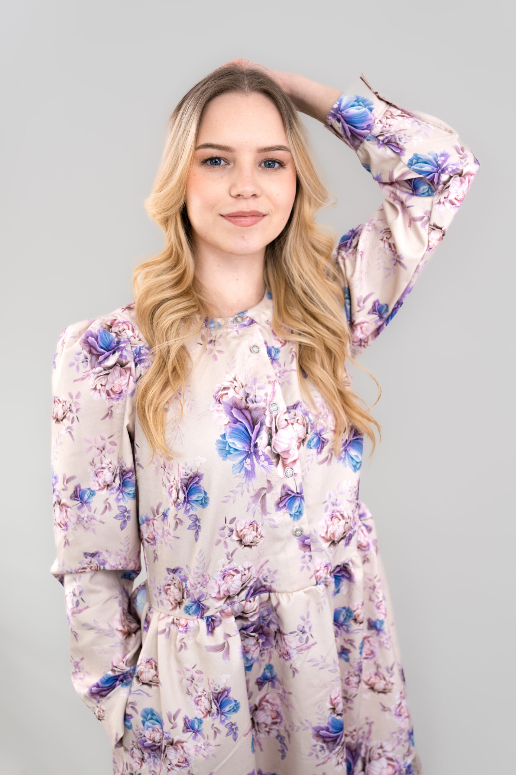 Mekko on valmistettu 100 % puuvillasatiinista, joka hengittää ja laskeutuu kauniisti. Edessä ja hihansuissa olevat napit tuovat ilmettä ja monikäyttöisyyttä, kun taas rypytykset vyötäröllä, helmassa ja olkapäillä luovat naisellisen ja kevyesti liikkuvan siluetin.