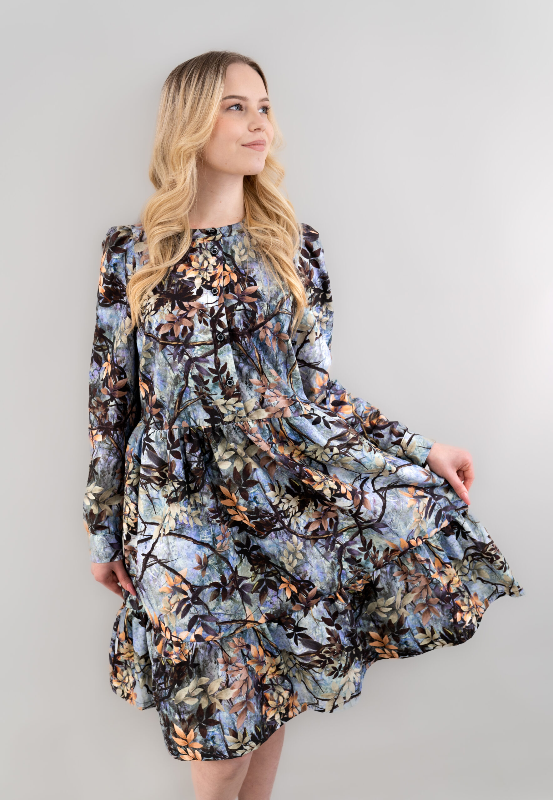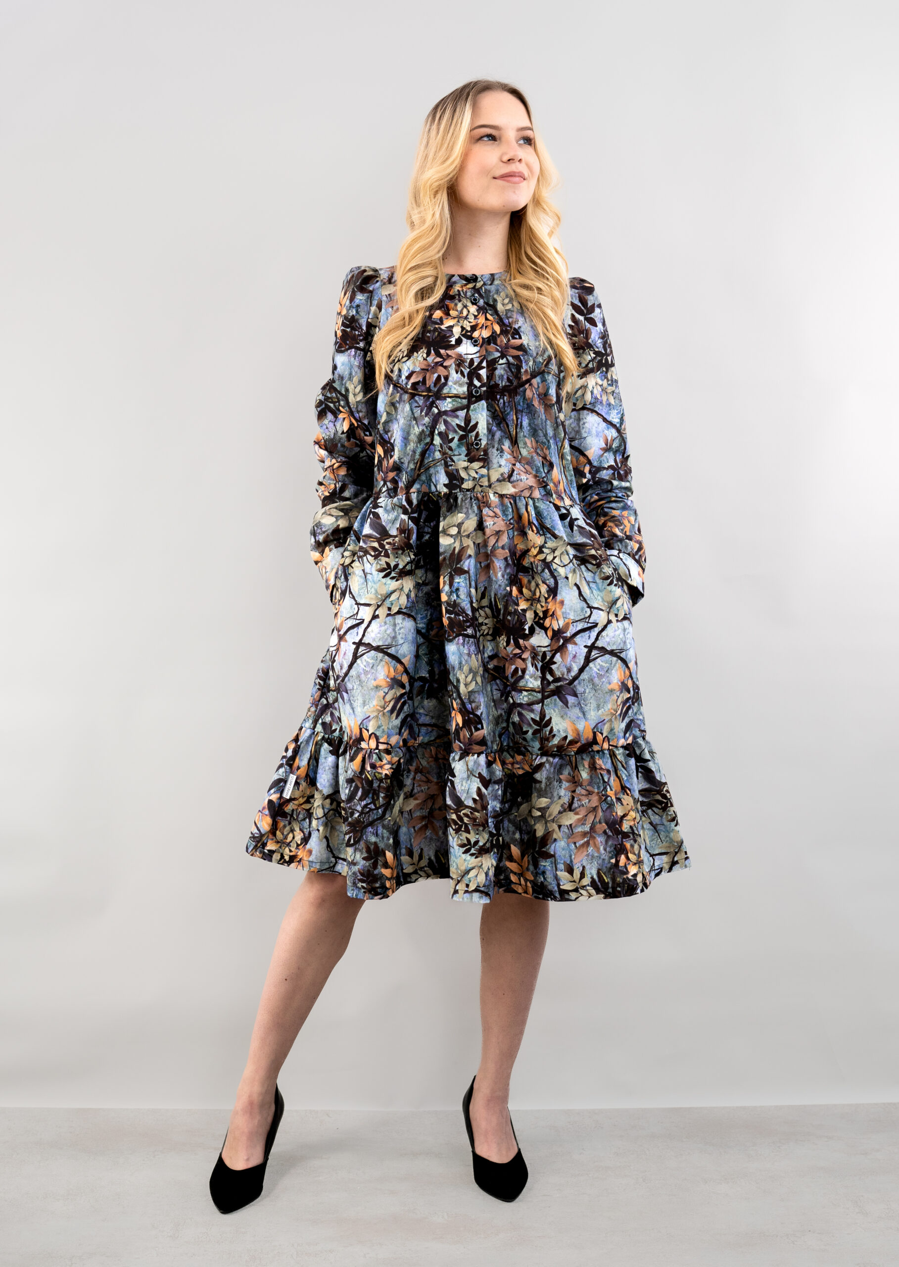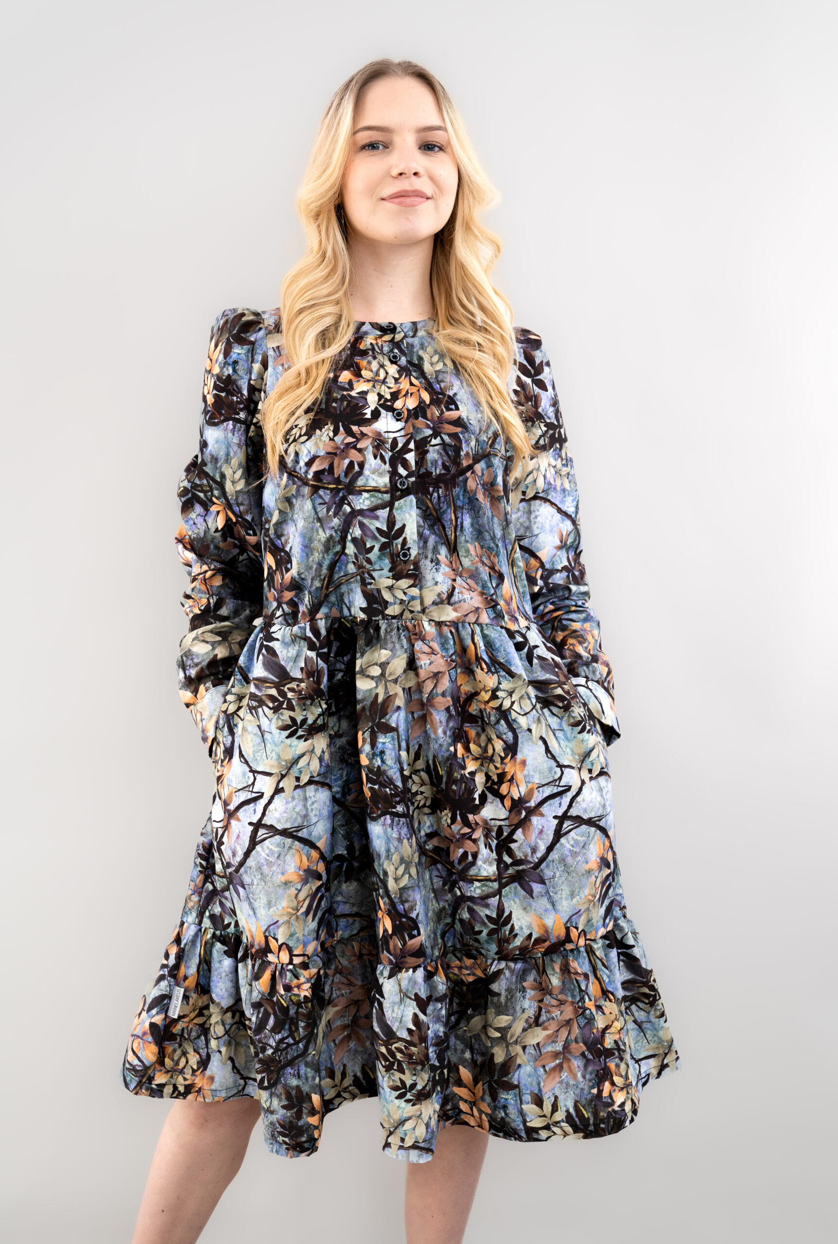 Mekko on valmistettu 100 % puuvillasta, joka hengittää ja laskeutuu kauniisti. Edessä ja hihansuissa olevat napit tuovat ilmettä ja monikäyttöisyyttä, kun taas rypytykset vyötäröllä, helmassa ja olkapäillä luovat naisellisen ja kevyesti liikkuvan siluetin.