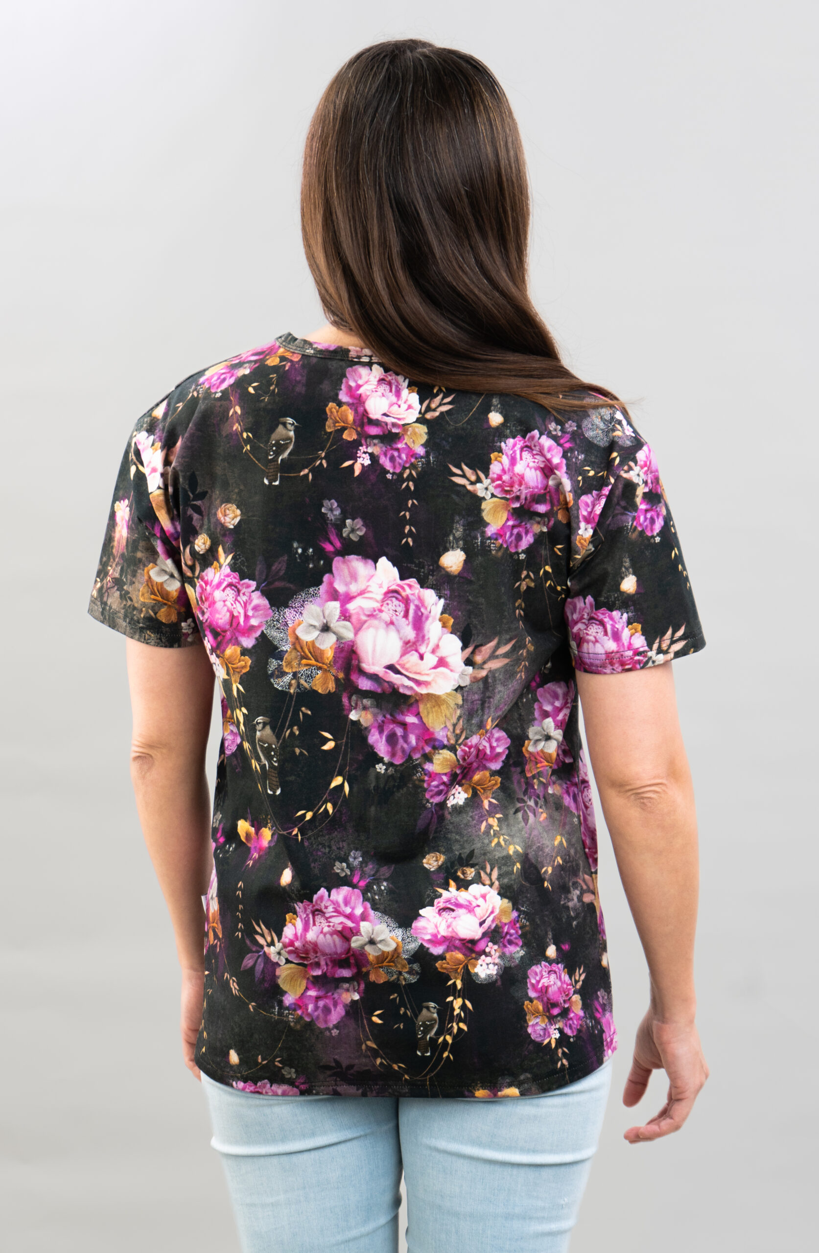 Swing of Dreams on tummanpuhuva ja näyttävä kuosi, jossa hehkuvat kukat, hennot köynnökset ja pienet lintuyksityiskohdat luovat syvän, unenomaisen tunnelman. Tumma pohja antaa kuosille salaperäisyyttä ja korostaa kukkien voimakasta loistoa kauniisti.